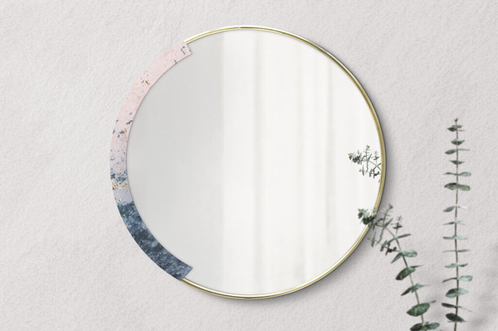 A marble-framed mirror hangs on a beige wall. Next to it is a plant cutting in a vase. No human reflection is visible in the mirror. The photo accompanies a blog post about the psychology of humility.